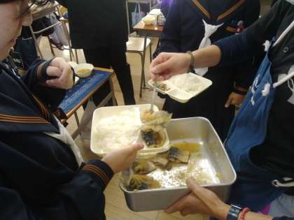今日のおかずは「さばのみぞれかけ、すまし汁、小松菜の煮びたし」と純和風で、ご飯によく合う組み合わせでした。欠席生徒分のさばもおかわりし、ご飯もおかずもおいしくいただきました。