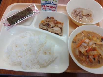 今日の献立は「ご飯、鶏肉の甘辛焼き、みそ汁、大根の煮もの、焼きのり、牛乳」でした。