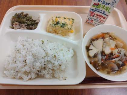 今日の献立は「菜飯、具だくさん卵の千草焼き、五目汁、豚肉と三度豆のいためもの、牛乳」でした。