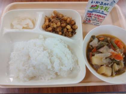 今日の献立は「ご飯、鶏肉と野菜の煮もの、じゃこ豆、かぶのゆず風味、牛乳」でした。
