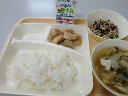 今日の献立は「ご飯、鶏肉の甘みそ焼き、五目汁、高野どうふのいり煮、牛乳」でした。