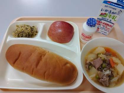 今日の献立は「黒糖パン、豚肉と野菜のスープ煮、カレーソテー、りんご、発酵乳、牛乳」でした。