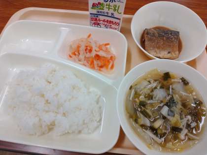 今日の献立は「ご飯、さばのみそ煮、すまし汁、紅白なます、牛乳」でした。
