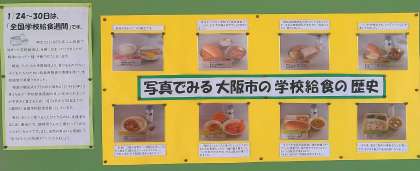給食室前掲示板に給食献立の変遷が紹介されています。