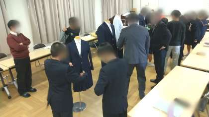 今回は、令和7年度から選択肢のひとつとして導入を予定しているブレザーの検討見本のお披露目でした。現在の標準服のスカートやスラックスとも組み合わせやすく、男女兼用や伸縮性があり洗えるなどの生徒達の意見が反映されたものを、プロジェクトに協力いただいた4つの販売会社が作ってくださったものです。試着後の生徒達の質問にも丁寧に答えてくださり、予定時間をこえる大変有意義な委員会となりました。