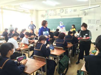 “かっちゃん(マシュマロマン)”と一緒にクッキーを持って行ったのですが、生徒たちの反応はさまざまでした。突然、クラスに“かっちゃん”が入ってきて、ビックリした子もいましたが、手を振ってくれたり、握手をしてくれたり・・・楽しんでいただけたかと思います。