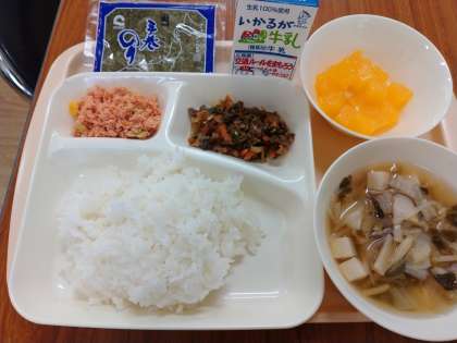今日の献立は「手巻きご飯(牛肉とコチジャンいため、さけのカラフルそぼろ)、すまし汁、ダイスゼリー(みかん)、牛乳」でした。