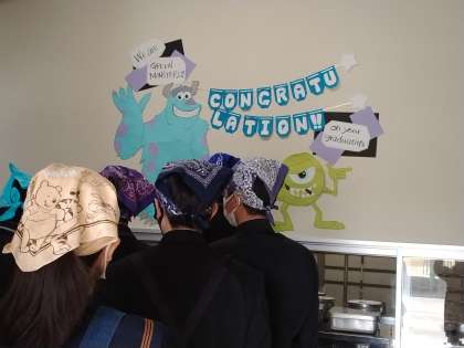 (写真下)給食室では、調理員さんが3年生に向けてのお祝いのメッセージを作ってくださいました。「3年間、ありがとうございました!」3年生からは感謝のあいさつが何度も聞こえていました。