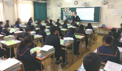 写真は、入場30分前のある教室のようすです。保護者の皆さんはすでに式場で待っておられます。積み上げられた教科書を前に緊張した面持ちで学級担任からの説明を静かに聞いていました。