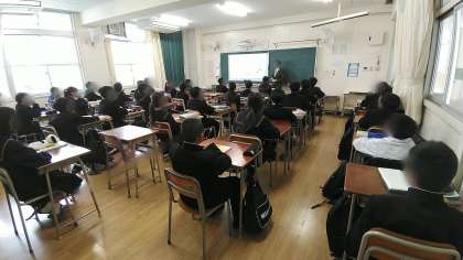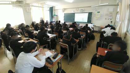 暖かな昼下がり、少し眠くなる5時間目の授業ですが、頑張っていました。写真は、1年美術科で先生の作品を見せながら自己紹介が行われている場面と、2年英語科でこれからの英語学習への意気込みを書いている場面です。