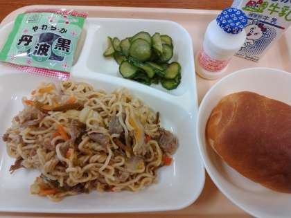 今日の献立は「ミニコッペパン、焼きそば、きゅうりのしょうがづけ、ソフト黒豆、発酵乳、牛乳」でした。