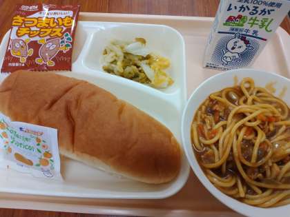 今日の献立は「コッペパン、アプリコットジャム、カレースープスパゲッティ、キャベツのピクルス、おさつチップス、牛乳」でした。