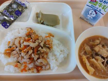 今日の献立は「かやくご飯(きざみのり)、みそ汁、まっ茶ういろう、牛乳」でした。
