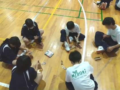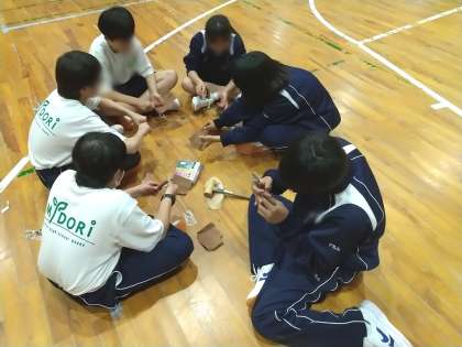 スポレクをしている間に山道を中腹まで視察しましたが、苔むした急斜面の岩の路面もあり、オリエンテーリングは中止する判断をしました。写真は、雨天時メニューのひとつのスプーン製作です。