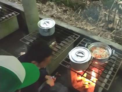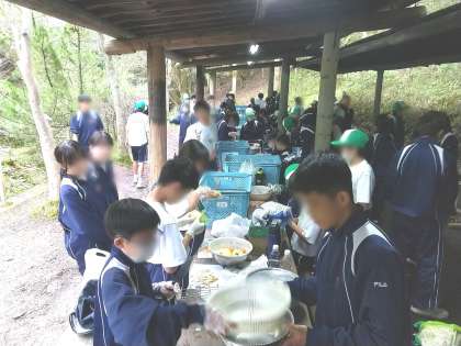 朝のつどいの時は快晴でしたが、朝食時には雨が降りだしました。昨日もオリエンテーリング開始直前で降雨に見舞われ予定変更を余儀なくされましたので不安でしたが、体育館から野外炊飯場へ移動する頃には雨が止み、以降は初夏の爽やかなそよ風のなかでのカレーづくりでした。