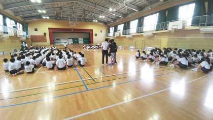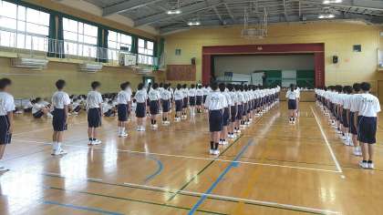 本日より体育大会前特別時間割になり、学年練習の時間帯が割りふられます。あいにくグランドの状態が悪く、2年1年は、体育館で集合や整列の練習を行っていました。