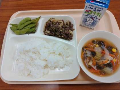 今日の献立は「ご飯、チンジャオニューロウスー、中華みそスープ、枝豆、牛乳」でした。