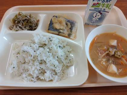 今日の献立は「菜飯、さごしのおろしじょうゆかけ、みそ汁、野菜いため、牛乳」でした。