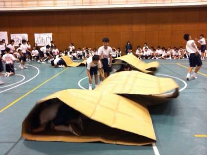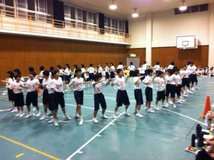 夜のレクレーションは室内オリンピックを行いました。風船割やピン球運びなどの団体競技をクラス対抗で競います。途中、応援合戦で各クラスのボルテージは最高潮に高まり、ラスト種目の「とっとこハム太郎DX」においてデッドヒートを繰り広げました。見事総合優勝を手にしたのは5組。早朝からの活動に弾みをつけます。