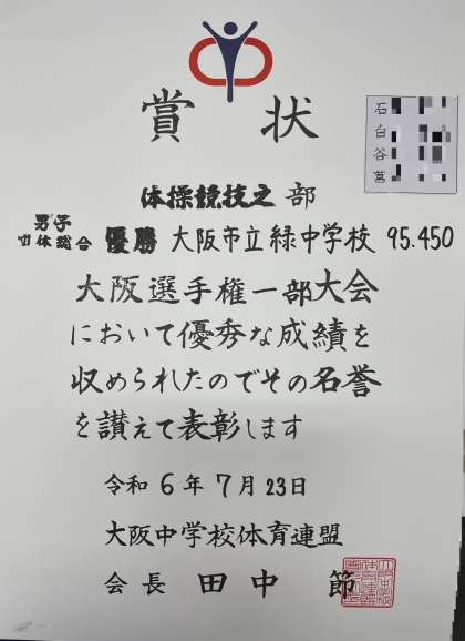 一昨日(23日)大阪中学校体育連盟主催の体操競技之部大阪選手権一部大会において、優勝しました。日ごろの鍛錬が素晴らしい結果につながりましたね。おめでとうございます。