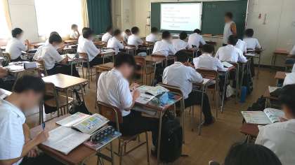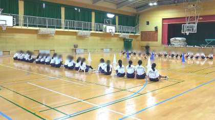女子は、体育館でレイアップシュート練習の説明を聴いていました。男子は、教室で一酸化炭素中毒の話を聴いていました。