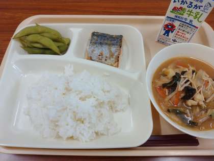 今日の献立は「ご飯、さごしの塩こうじ焼き、みそ汁、枝豆、牛乳」でした。