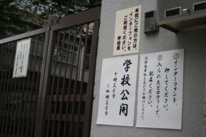 【入校方法】正門にあるインターフォンを押し「学校見学へ来ました」とお伝えください。正門で名簿にお名前をご記入いただき、保護者証(小学校発行)着用のうえご入校ください。