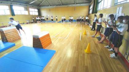 格技室で行われた授業では、ペアで跳び箱の開脚跳びを撮影しあい、映像をもとにアドバイスしあいます。