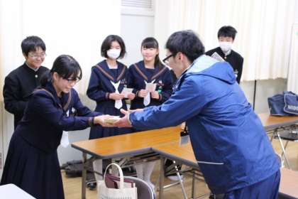 本日、鶴見区社会福祉協議会の方が募金を取りに来られ、生徒会が責任を持って渡しました。はじめ、社会協議会の方から募金の使い道を説明していただき、感謝の意を伝えられ、募金の大切さや、意義を学ぶことができました。