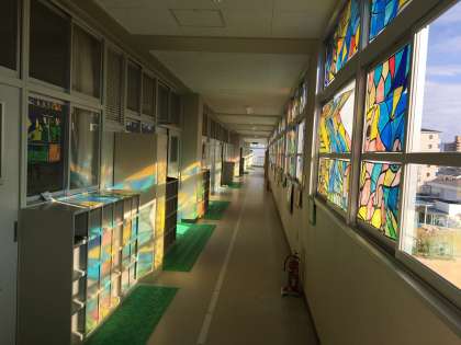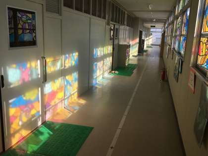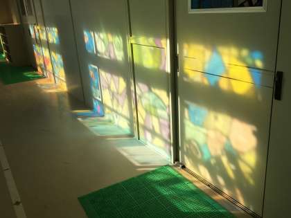 冬が近づき太陽光の入射が低くなってきました。いい感じでステンドグラスの模様が4階の壁に映っています。