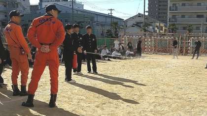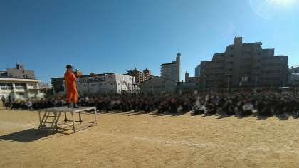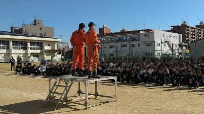大阪市消防局鶴見消防署の署員のみなさんに来ていただき、指導講評をお願いしました。800名以上が数分で運動場に避難完了したことを褒めていただきました。