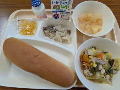 今日の献立は「コッペパン、みかんジャム、あじのレモンマリネ、てぼ豆のスープ煮、白桃(カット缶)、発酵乳、牛乳」です。