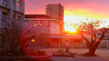 鶴見緑地の方から桜の大木に陽光が射し込みます。日々、空が明るくなる時刻が早くなりますね。今日もよい天気です。
