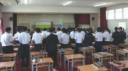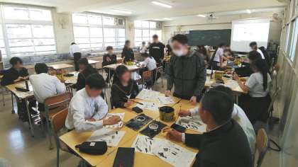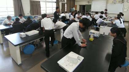 4月30日、今年度も早くも1か月過ぎました。特別教室での授業では、理科室で2年水の電気分解実験、音楽室で3年合唱、美術室で3年水墨画を行っていました。