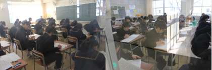 中学校生活最後の定期テストとあって、チャイムが鳴るぎりぎりまで見直しに余念がない生徒が多く、どのクラスも集中してテストに臨んでいる様子が見られました。