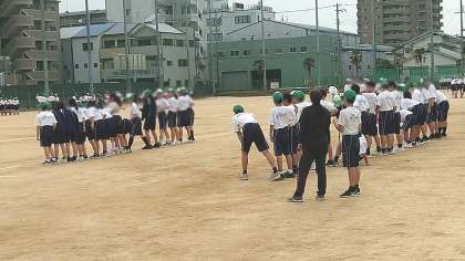 学級ごとに運動場に集まり、横列で、隣の人と足首を紐で縛ります。二人三脚ならぬ何人何脚になるのでしょうか。