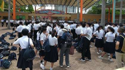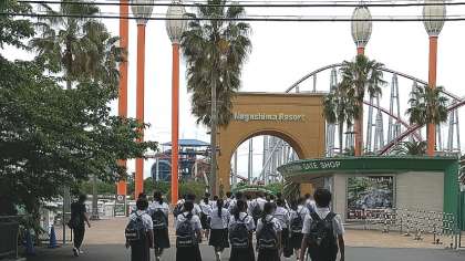 ナガシマスパーランドに到着しました。バス内で昼食をとったのでさっそく班別行動です。