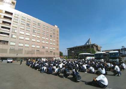 バスに乗車して、ラフティングや選択別体験に出発します。
