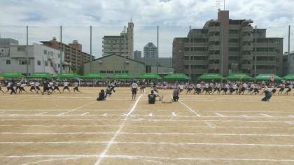 真ん中の写真は、クラス縦割り対抗男女混合綱引きです。3学年が協力します。