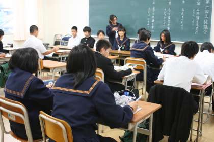 生徒議会は、日々の学校生活を中心となって支える生徒たちが集まっています。代表を務める生徒らは、真摯な態度で議会を進行していました。