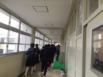 今後起こり得る大規模地震・津波等に備えるため、地震が起こった後に津波警報が発表されたことを想定して、生徒全員が4階に避難する訓練を実施しました。