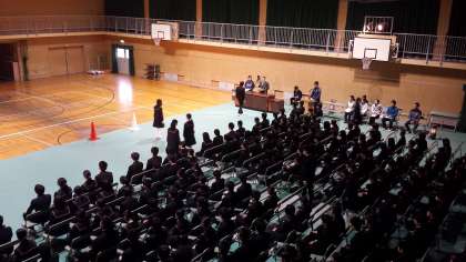 本日、三年生は卒業式の予行を行いました。明日は公立高校の一般入学者選抜のため、今日が最後の練習です。予行には在校生の代表生徒や吹奏楽部も参加し、卒業式当日と同じ流れで卒業証書の受け取りや合唱の練習などが行われました。あさっての卒業式では、中学校三年間で成長した55期生の姿を見せてくれることと思います。