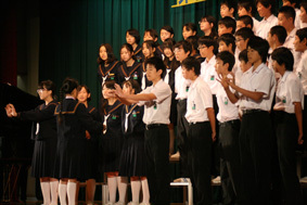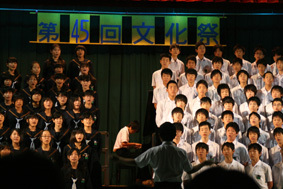 合唱コンクール準優勝クラスの3組は「宙船」が歌われました。思いがけない演出があり会場は大盛り上がり、体育館がまるで船のようになりました。続く合唱コンクール優勝クラスの5組は一青窈の「ハナミズキ」です。難しい曲を息の合ったハーモニーで美しく歌い上げました。最後のサビで、前列の生徒が一歩進み手話で合唱に加わっったことで5組の合唱が完成しました。積み上げてきた練習を感じさせる合唱に、会場は静寂に包まれました。