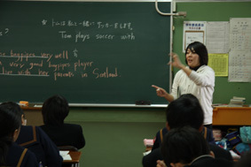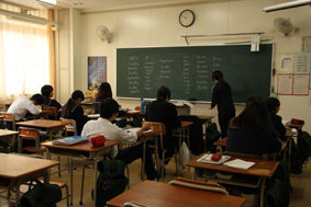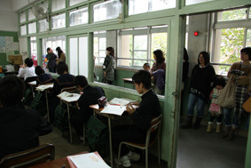3年生の英語は分割授業です。教室を二手にわかれて、少人数で授業を進めます。一方、1年生英語では、クラスみなで授業を作ります。進度や単元、生徒の学習状況など、その時々によって授業の作り方が工夫されています。本日の授業は、見守ってくださる保護者の姿が、子どもたちの学びの刺激になっています。