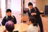 作業所では慣れない作業を一つずつていねいにこなし、一緒に働いていました。また高齢者福祉施設では、「ことわざカルタ」で一緒に遊んだり、しわ無くシーツをひくコツを教わっていました。
