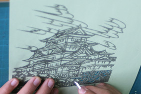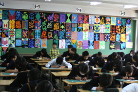 本校西館4階にある美術室は、公開授業のあいだ、静かに作業する生徒の姿が見られました。取組む作品は「切り絵」です。保護者の方々に見守っていただけたことで、細かな作業にも関わらず、いつも以上の集中力で取り組むことができました。