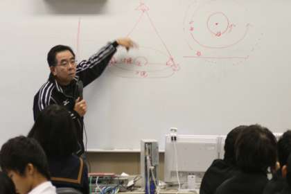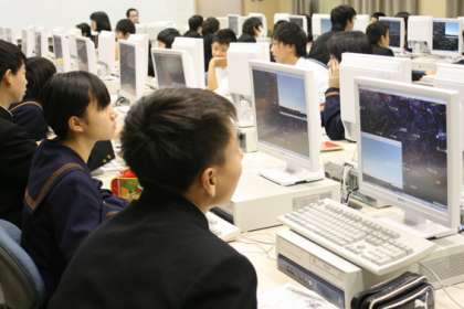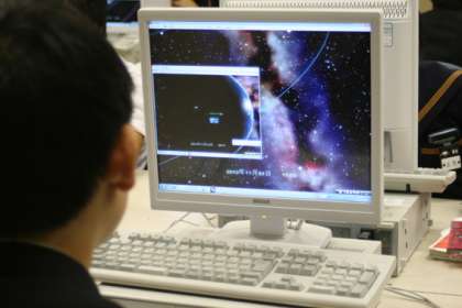 そこで、3年生はシュミレーションソフトを用いた授業を展開しています。パソコン教室へ移動した生徒らは、国立天文台がフリーソフトとして開発した「Mitaka」をクリック。するとモニター画面は宇宙空間に繋がります。「Mitaka」は天文学の様々な観測データや理論的モデルを見るためのソフトウェアです。 地球上に視点を置き天体を観測するだけでなく、宇宙の大規模構造に飛び込んでいくことも可能です。このソフトを使って、 宇宙の様々な構造や天体の位置、規則性を学んでいきます。あくまでシュミレーションですが、時間や位置情報等の細かな設定もでき、知りたいことを探求することができます。