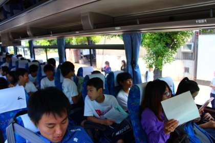 先程、健康観察、出発式を終えました。全員バスに乗り込み、無事出発です。