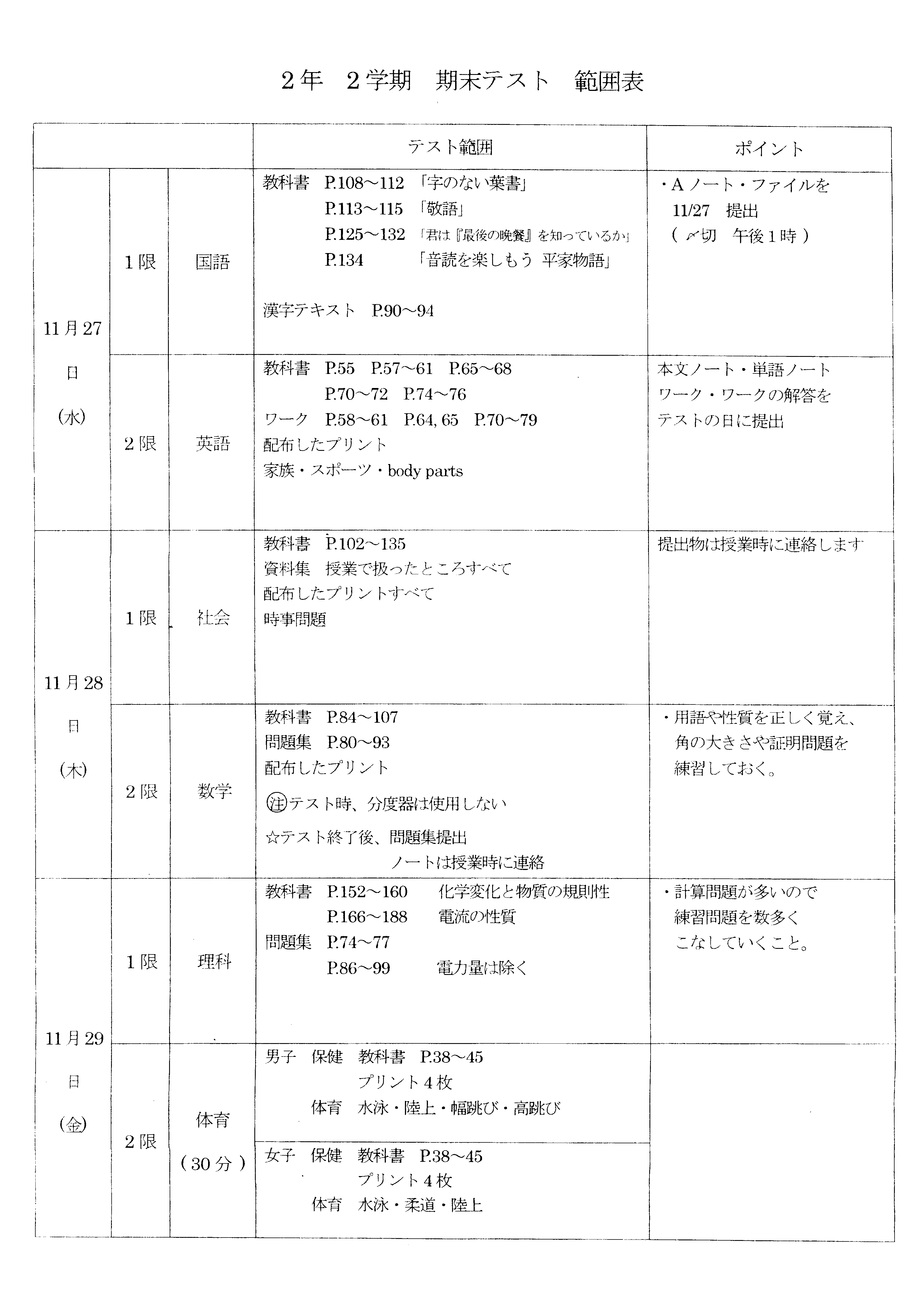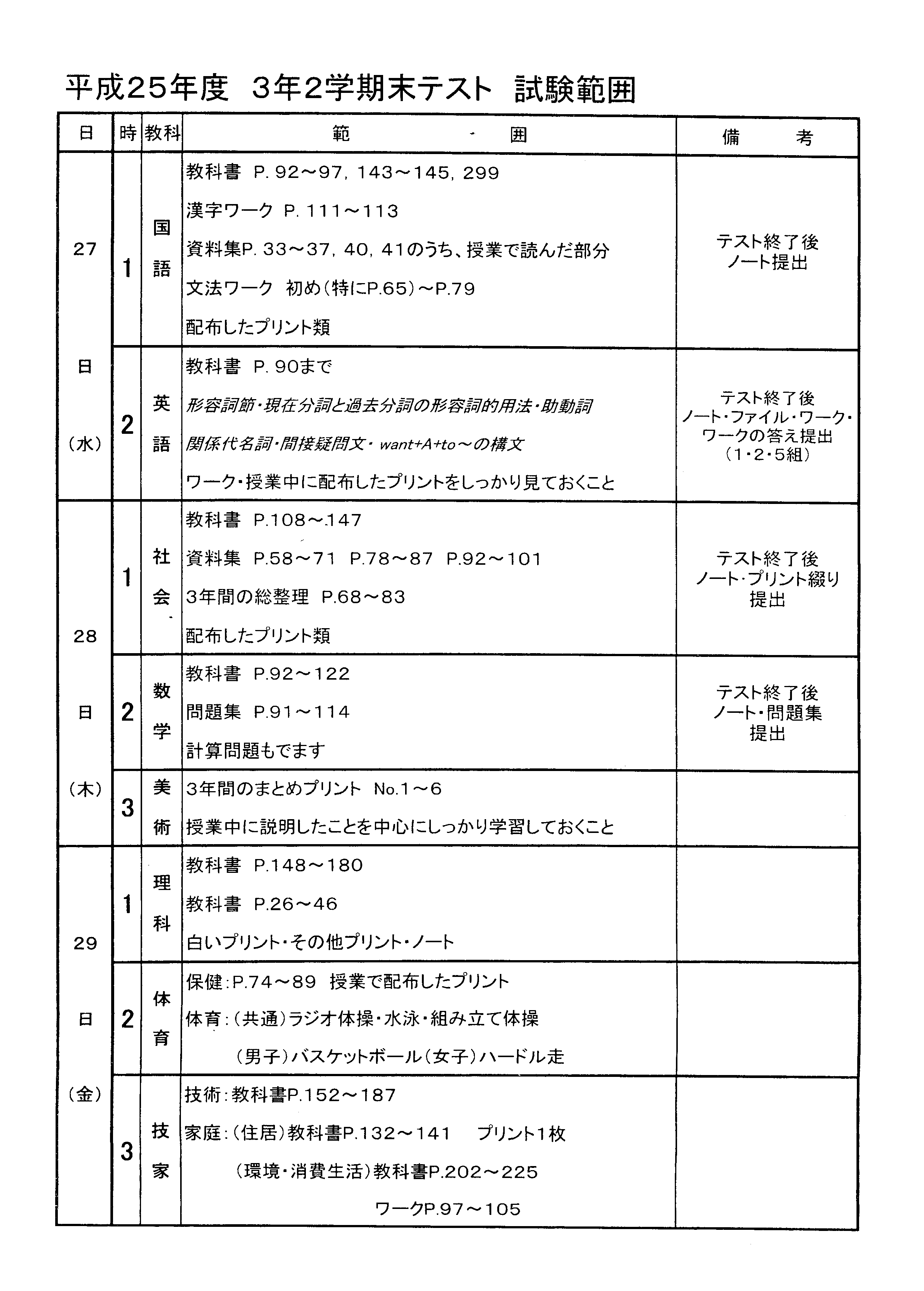期末テスト1週間前! 公開日 2013/11/20 更新日 2013/11/20 お知らせ 11月27日(水)から、期末テストが始まります。 2学期の集大成!普段の力を出し切るとともに 教科によっては、ノート等の提出も併せて行われます。 ノート等の整理もしっかりしましょう。 テストの時間割は以下のとおりです。 27日(水) 国語、英語、音楽(1年生のみ) 28日(木) 社会、数学、美術(3年生のみ) 29日(金) 理科、保健体育、技術家庭(3年生のみ) テスト範囲表は、 以下の通りです↓ 1年生テスト範囲 2年生テスト範囲 3年生テスト範囲 テスト範囲は、変更等があります。 いいね(0)