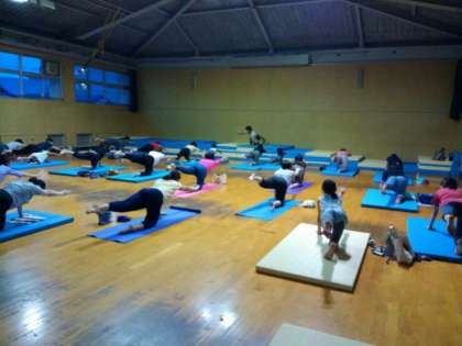 7月12日、ヨガ教室を行いました。ホットヨガ教室かと思うぐらいの暑さの格技室の中、26名の参加者と1時間、ゆっくり身体を動かし、汗だくでした。難しい動きは、ありませんが、意識する事で筋肉も気持ちも変わってくるそうです。普段、イライラした時などは、呼吸を深くする事で気持ちが落ち着くそうです。
